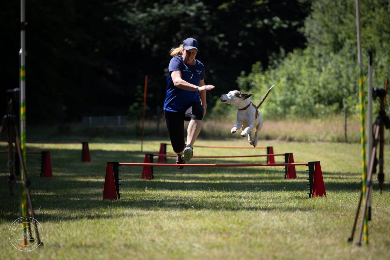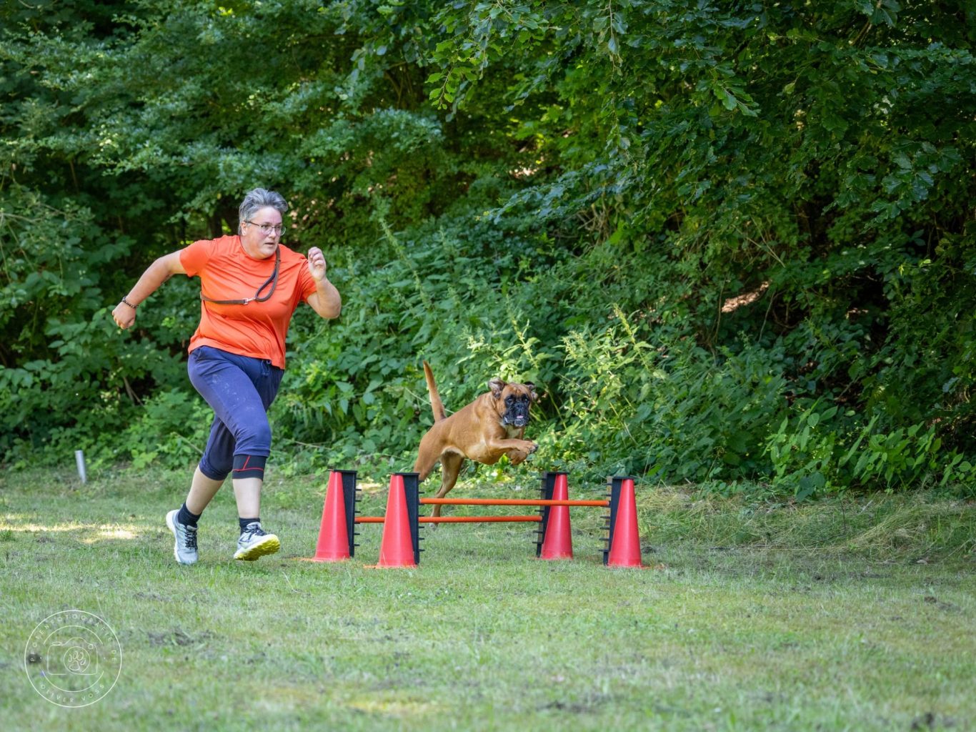 Nach der Aufwärmung, die fast eine Dreiviertelstunde dauerte, kamen wir bei Steigerungsläufen und Starttraining ordentlich außer Puste. Nach einer kurzen Entspannungspause folgten Hürden- und Slalomlauf aus dem THS, ohne Hund, aber auf Zeit. Danach folgten ein Cooldown und eine wohlverdiente die Dusche.