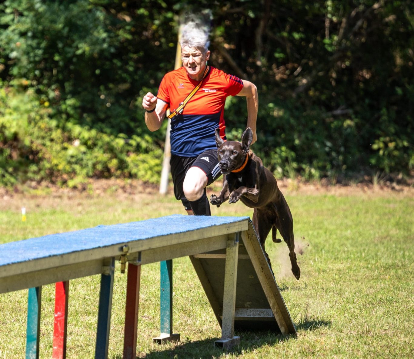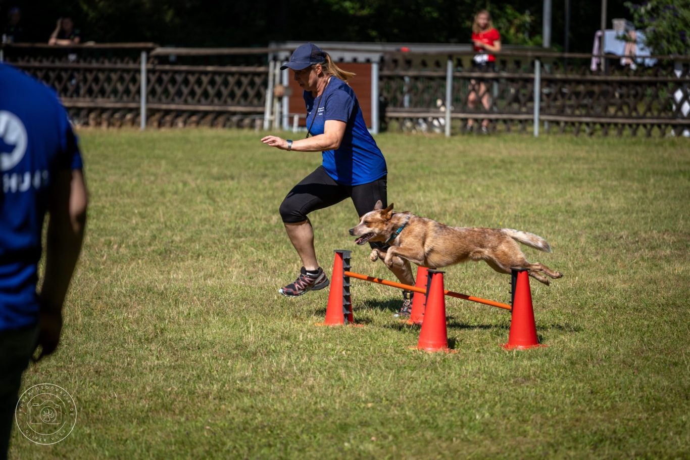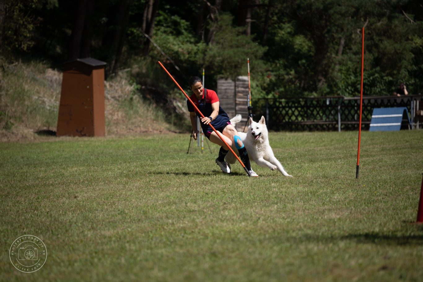 Anschließend ging es für Beate mit ihrer Busca zur Unterordnung auf den Platz. Busca zeigte sich beeindruckt von der Situation und konnte ihre gewohnten Leistungen leider nicht abrufen. 34 Punkte. Kurz die Krone gerichtet, Tränen weggewischt, und so ging es in der Mittagssonne für alle Vierkämpfer an die Laufdisziplinen. Auf perfektem Rasen konnten alle Teams ihre Bestleistungen zeigen.